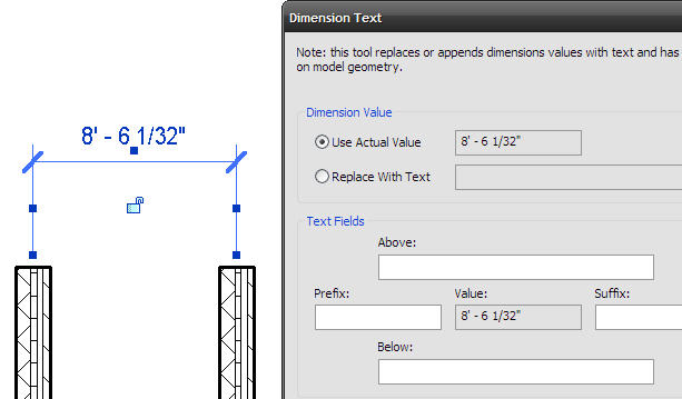The second, far more devious, way of fudging a dimension string is to override the text. For the last few versions of Revit, you could double-click on the dimension and add some text as a prefix or suffix, or even replace the dimension value with a piece of text. Revit is mostly smart and will not allow you to replace the value with another number. See? Revit doesn’t want you to cheat! But there is a way…