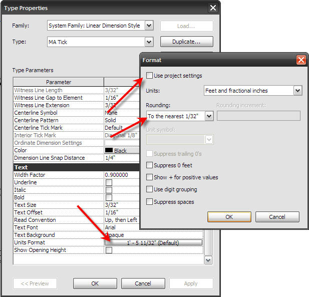 The first way to fudge your dimension is to override the accuracy on it. By default, it’s going to take your project settings, but you can get into a dimension type and change that accuracy. I’ve seen several times when someone has a 1/32″ (that’s our default project accuracy) show up in a dimension string, they don’t bother fixing it, they override they change the ROUNDING under UNITS FORMAT to something lower.
