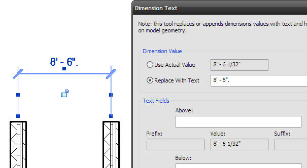 Here’s where the CHEATERS come in. If you toggle “Replace With Text”, and type in 8′-6″. (see that little period after the text?), Revit will allow it. You will have a tiny dot on your dimension string, but it’s changed. Congratulations, you have figured out a way to keep your sloppy modelling skills intact and not bother to make anything accurate. Good job!