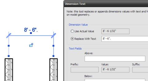 Let’s say your dimension value is 8′-6 1/16″. You want it to be 8′-6″. Double-click on the text and you will see the value in there.