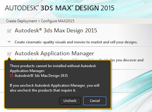 My AutoCrap deployment and my Revit deployment did this wonderfully. Uncheck the box, no Application Manager. And then I got to 3D Max Design…