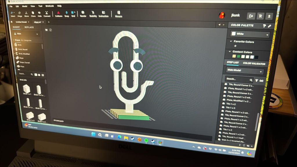 After a few days, everything showed up. Back in Studio, I looked at the model to remind myself how this goes together. And now Lego Clippy proudly sits on my office shelf… bringing delight to coworkers and confusion to my kids.
